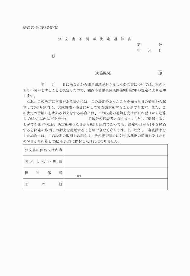 (3) 公文書の全部を不開示とすることの決定 公文書不開示決定通知書(様式第4号)