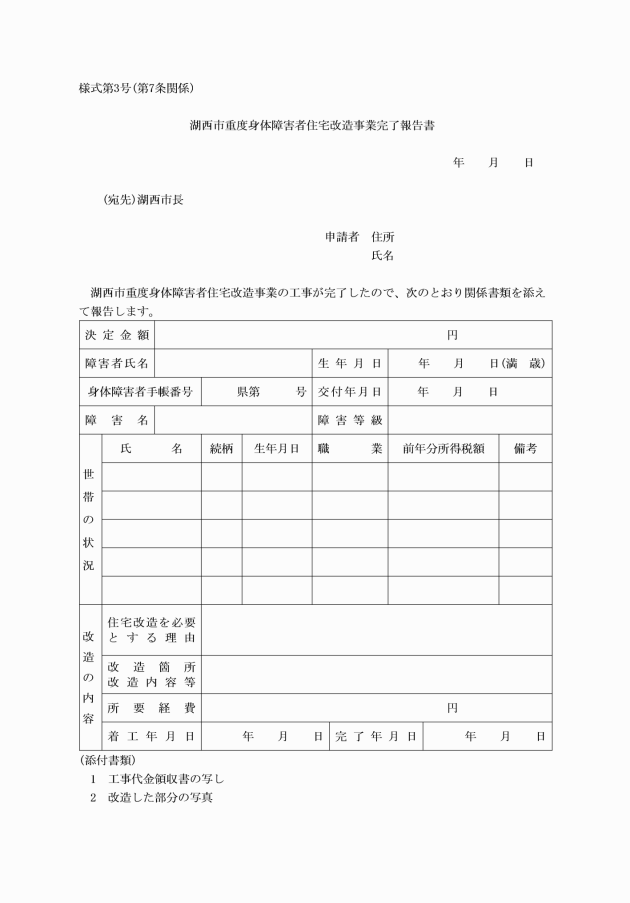第7条 助成金の交付決定を受けた者は、住宅改造事業の工事が完了したときは、速やかに湖西市重度身体障害者住宅改造事業完了報告書(様式第3号)に工事代金領収書の写し及び改造した部分の写真を添付し、市長に提出しなければならない。