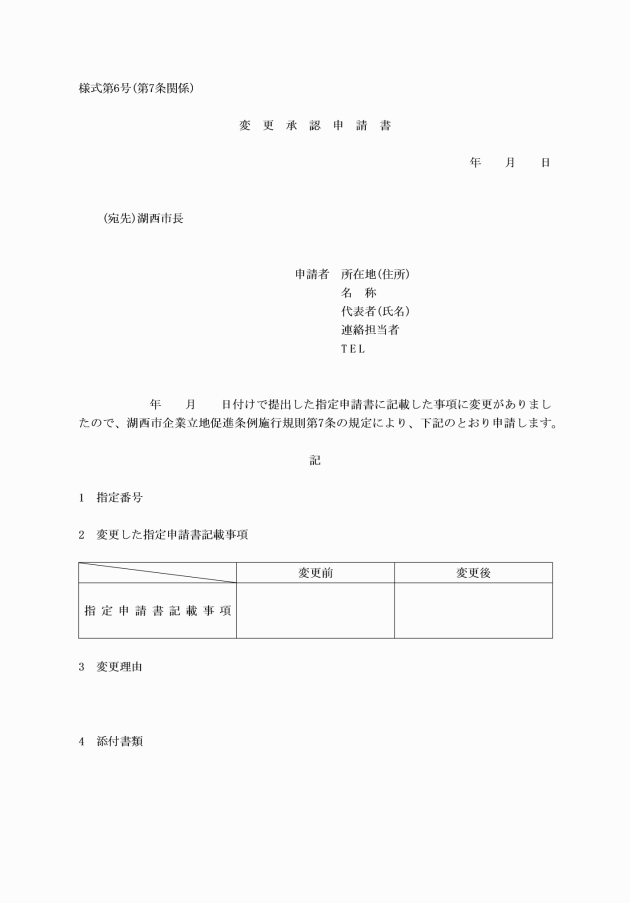 第7条 指定事業者は、指定申請書及び添付書類に記載された事項を変更しようとするときは、変更承認申請書(様式第6号)に次に掲げる書類を添えて市長に提出しなければならない。
