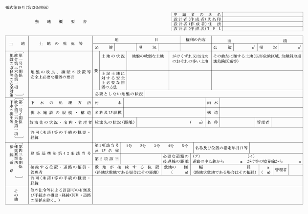 第13条 法第43条第1項の規定による開発許可を受けた土地以外の土地における建築等の許可を受けようとする者は、建築物の新築、改築若しくは用途の変更又は第一種特定工作物の新設許可申請書(様式第18号)に、施行規則第34条第2項に規定する書類のほか、次に掲げる図書を添付して市長に申請しなければならない。