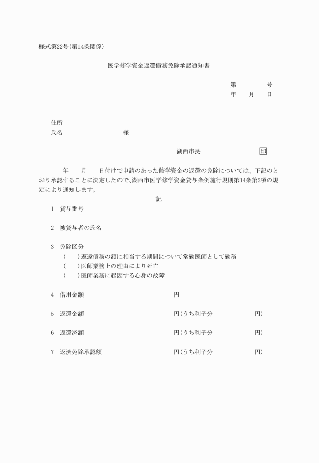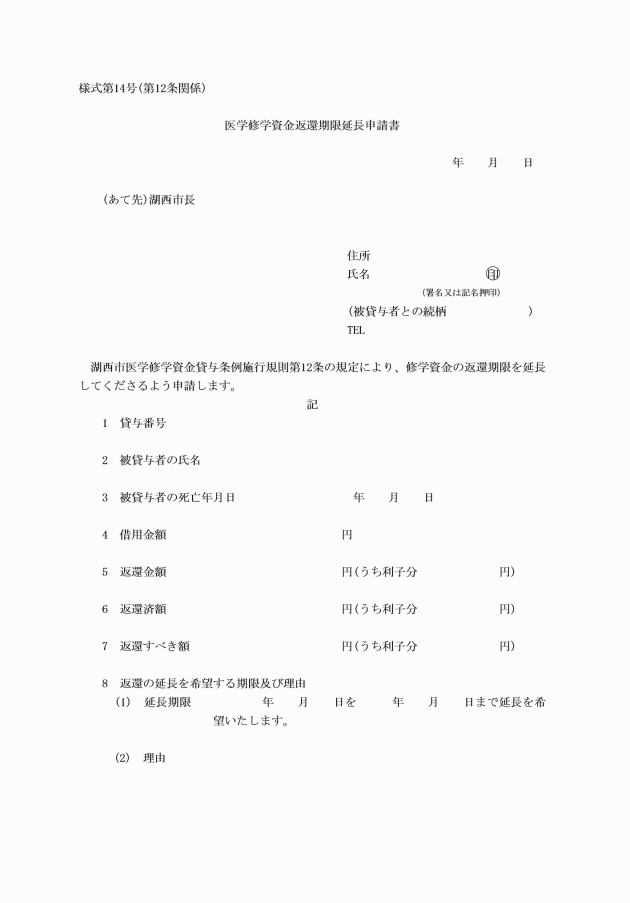 第12条 条例第13条第1項ただし書に規定する返還は、修学生又は修学資金の貸与を受けていた者(以下「修学生等」という。)が死亡したときは、条例第13条第1項の3月以内を1年以内に延長するものとする。この場合において、返還期限の延長を求めようとする者は、医学修学資金返還期限延長申請書(様式第14号)を市長に提出しなければならない。