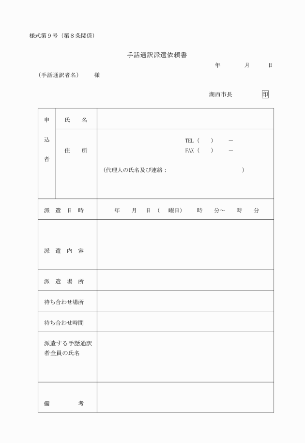 第9条 市長は、派遣場所が他市区町村の場合、当該他市区町村に登録されている手話通訳者の派遣を、手話通訳者派遣依頼書(様式第10号)により当該他市区町村の長に依頼することができる。この場合において、当該他区市町村に登録されている手話通訳者の派遣手当等は、湖西市が直接、当該手話通訳者に支給するものとする。