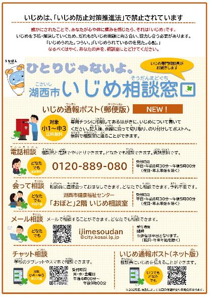 - 湖西市いじめ相談室は、少人数のいじめ専門相談員が相談をお受けします。