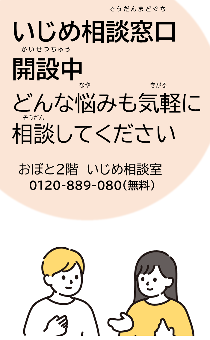 令和6年度から、学校外からのいじめ防止対策として「いじめ相談窓口」を開設しています。いじめられているこどもからの相談だけでなく、ご家族、友だち、「いじめを見た・聞いた」というまわりの人からの相談・通報もお待ちしています。あなたの声を相談室に届けてください。