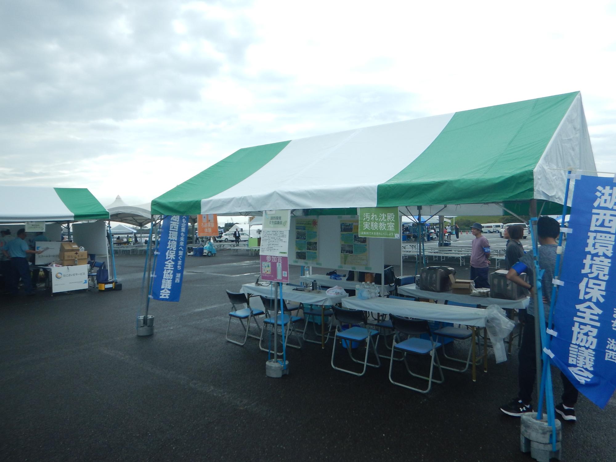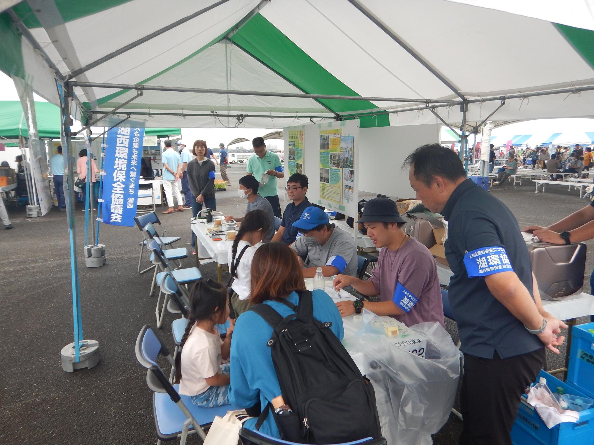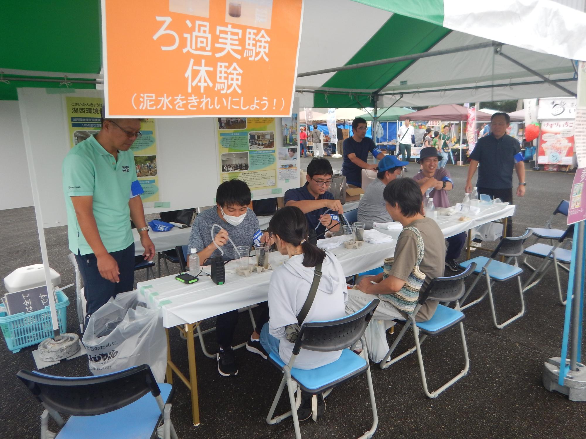 湖西環境保全協議会の活動内容の周知と水質の実験をメインに環境を守っていく取組について学ぶブースを出展いたしました。今年度は、参加者の皆様に水をきれいにする過程を体験していただくため、凝集剤を使った汚れ凝集沈殿実験とろ過実験を行い、計174名の皆様に実験していただきました。